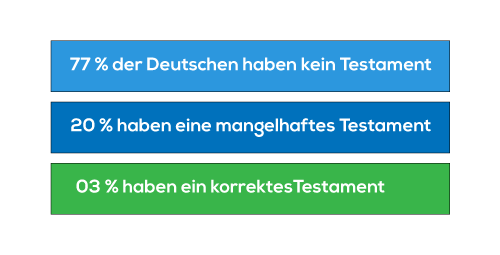 Fachleute gehen davon aus, dass in Deutschland rund 80% der Bürger kein Testament haben. Bei den übrigen 20% mit einer letztwilligen Verfügung wird weiterhin davon ausgegangen, dass 7 von 10 mangelhaft sind.